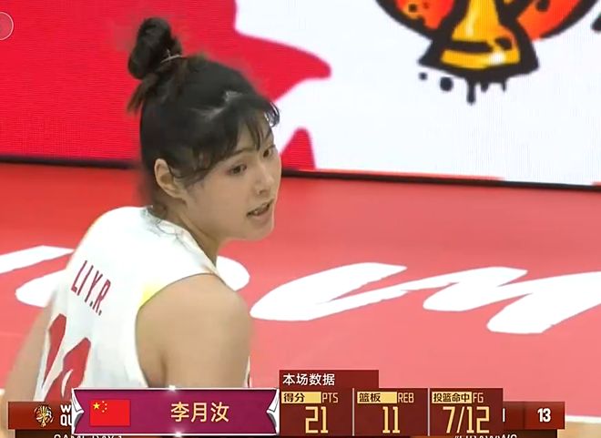 全场比赛,李月汝替补出场,打了20分钟,投篮12中7,砍下了21分11篮板1助攻1抢断的两双数据,其中,得分和篮板球都是排在全队第一。毫无疑问,李月汝就是中国女篮赢球的关键先生。